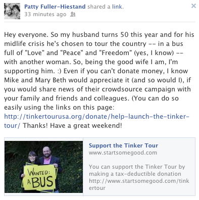 TGIF from Mike! May 10, 2013 · by Mike Hiestand · in Mike's Musings. · So it took a while, but my dear wife finally got around to sending out a post to her Facebook friends about our tour…. Share this:Share Click to share on X (Opens in new window) X Click to share on Facebook (Opens in new window) Facebook Click to print (Opens in new window) Print Click to share on LinkedIn (Opens in new window) LinkedIn Click to email a link to a friend (Opens in new window) Email Click to share on Pinterest (Opens in new window) Pinterest Click to share on Tumblr (Opens in new window) Tumblr Click to share on Reddit (Opens in new window) Reddit Like Loading... Related