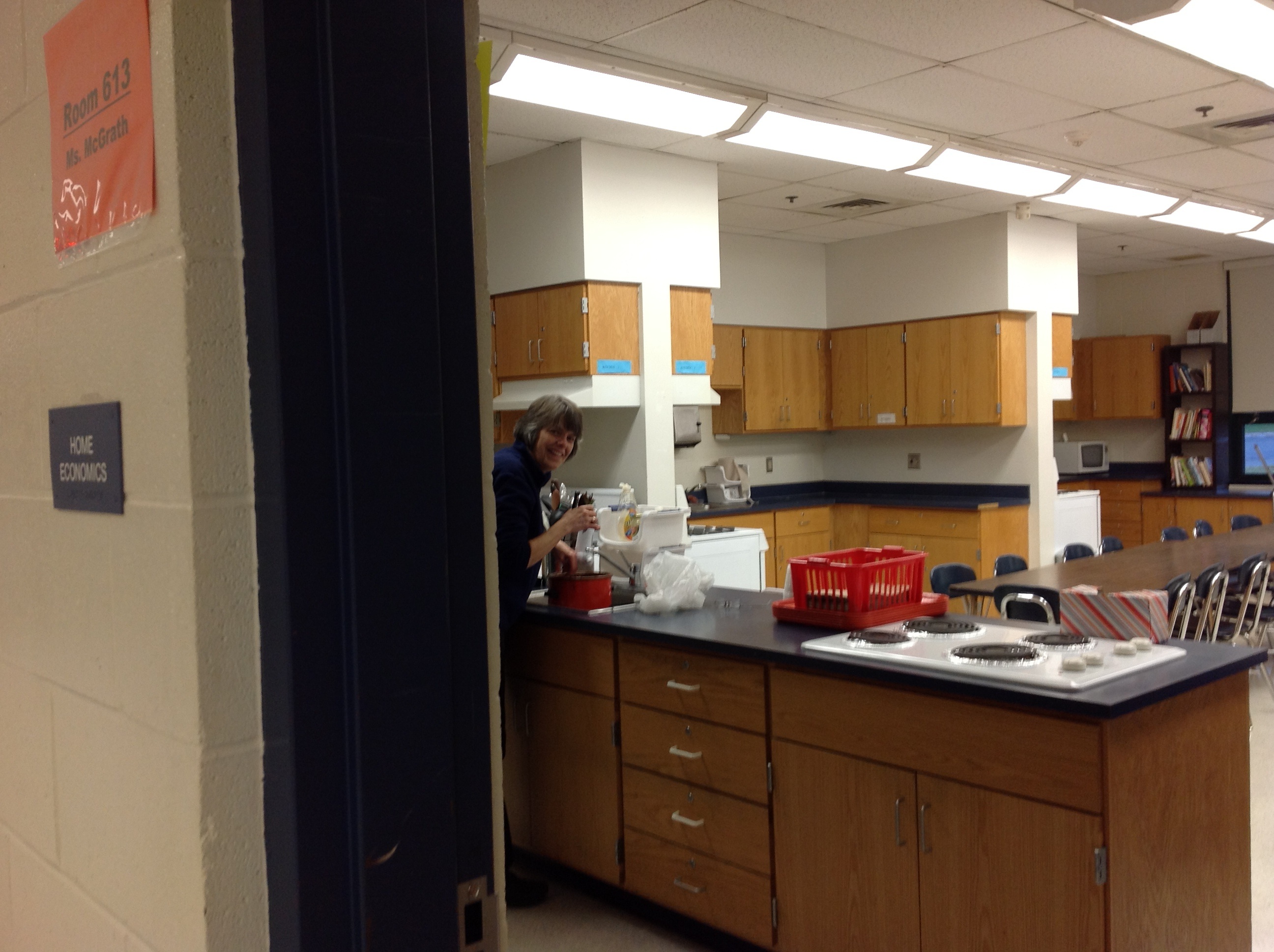 Mary Beth cleaning veggies for dinner in the South Hadley High School (MA) home ec room!