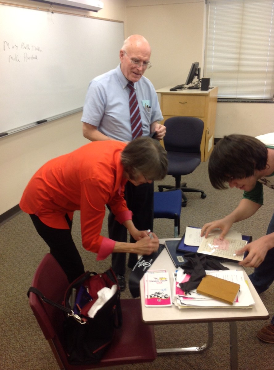 photo(13) Published November 4, 2013 at 960 × 1296 in Tinker Tour Week 7 in Review ← Previous Next → Lou Day’s class inspects MB’s pink slip from Harding. Thanks for the hospitality, Prof Day!