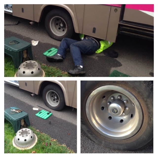 Thank goodness for a break in the tour — poor Gabby has a flat!