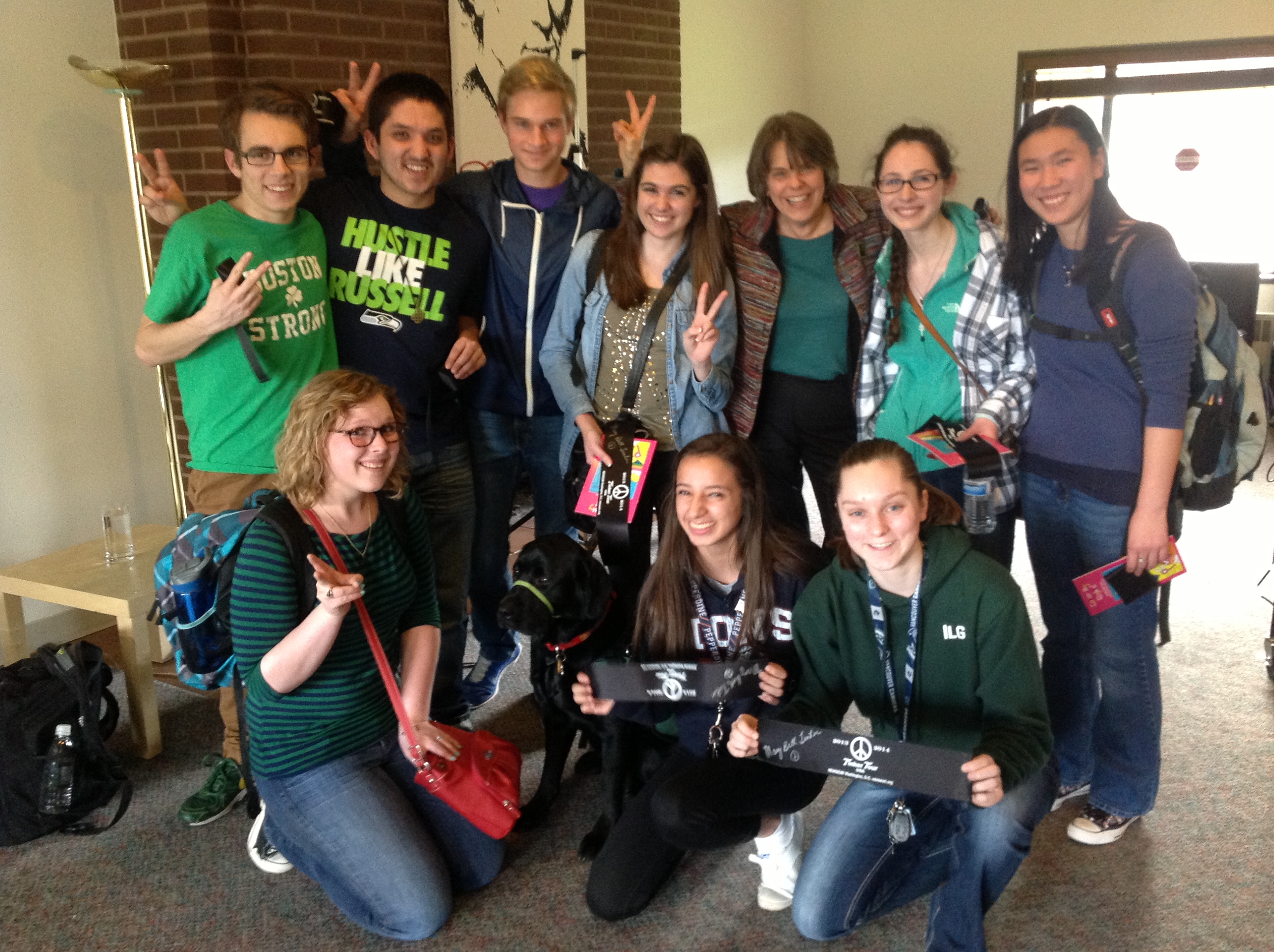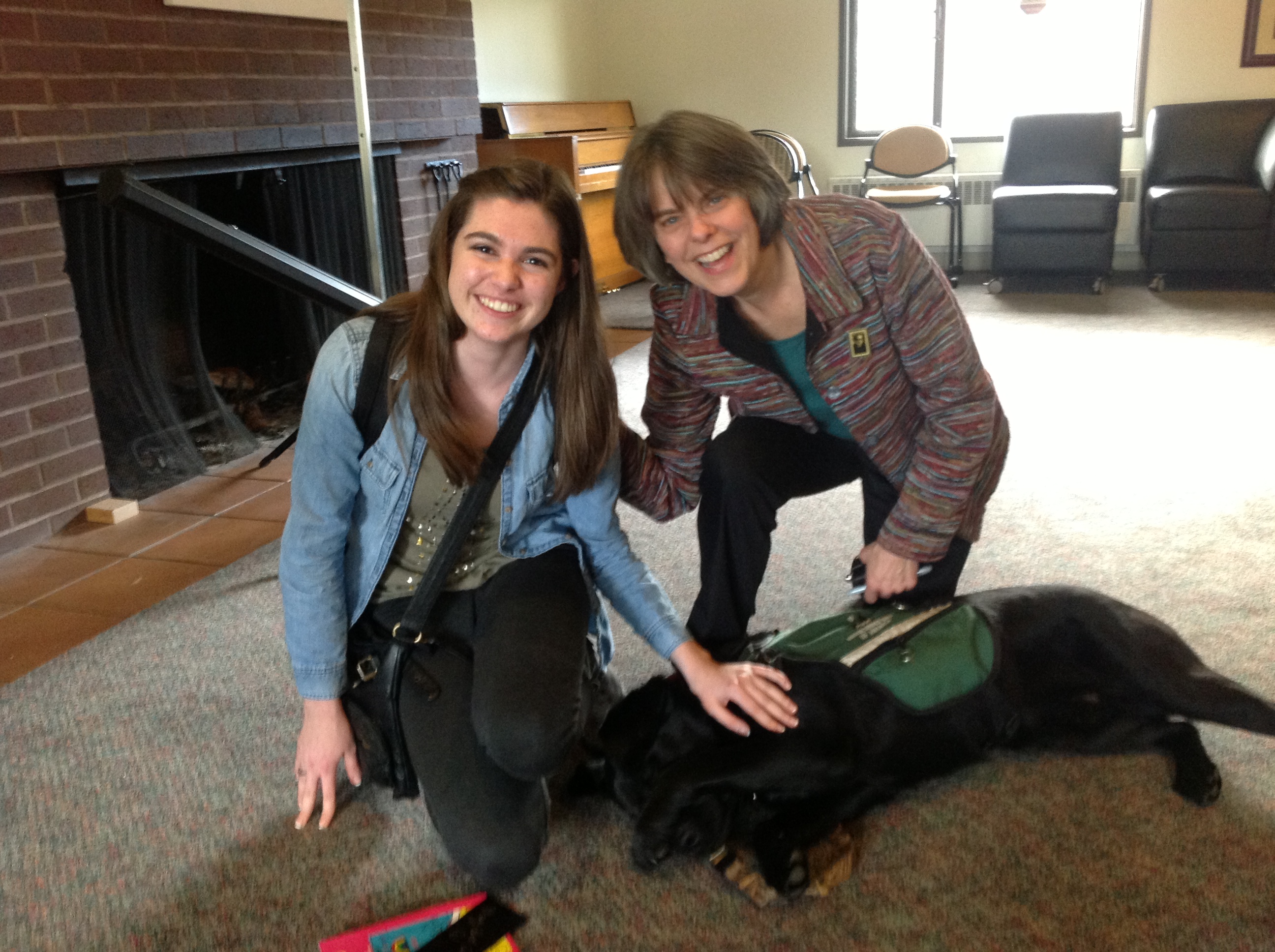 Beth Biggs, Mary Beth Tinker and Kai, a service dog being trained by Beth to help individuals with autism, get acquainted at LaSalle Prep in Milwaukie, Ore., during a March 17 stop of the Tinker Tour