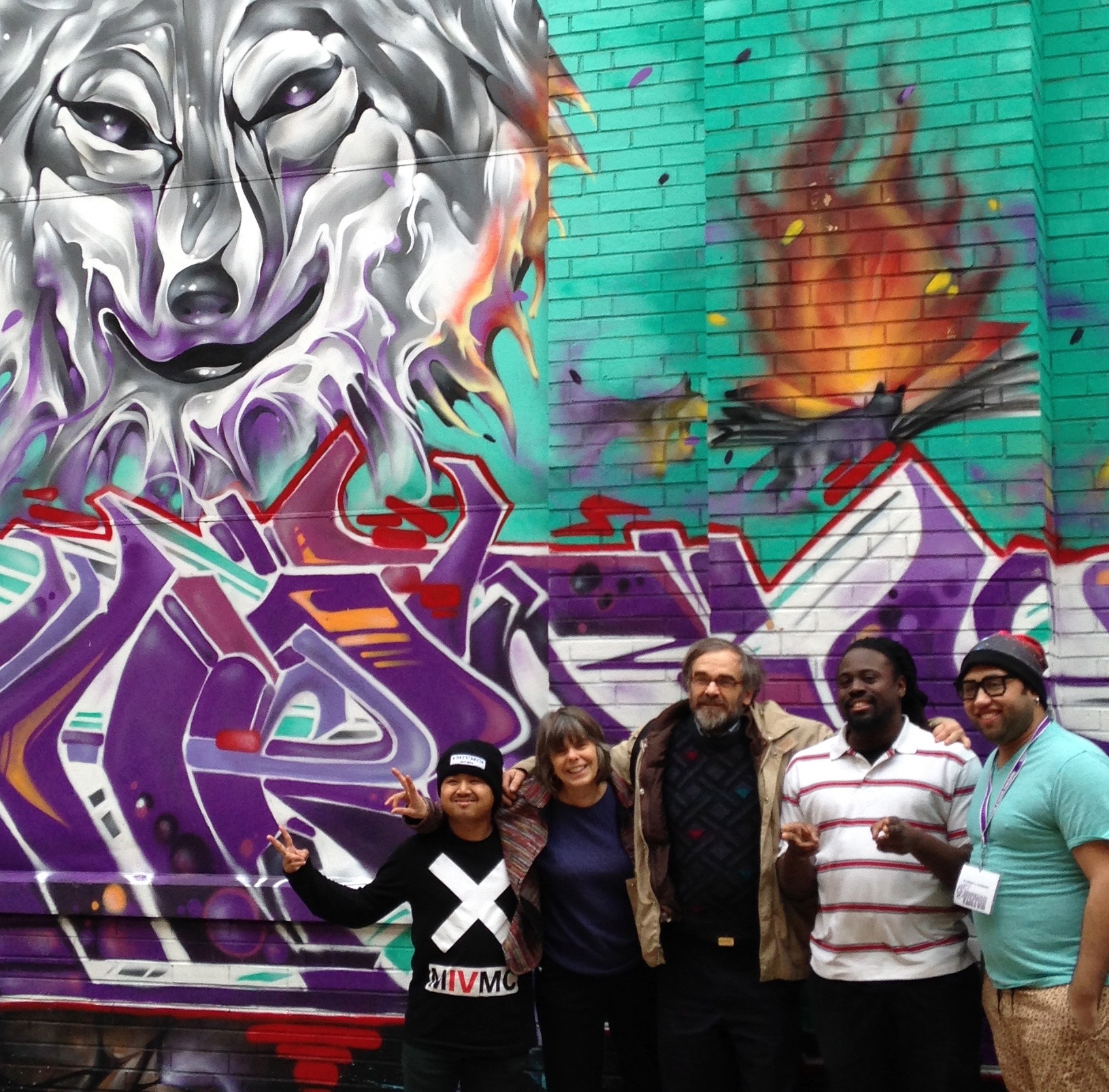 Mary Beth & John admire student artwork at Harding with breakdancing wizard Asan (on left) and art mentors Phate & Leter