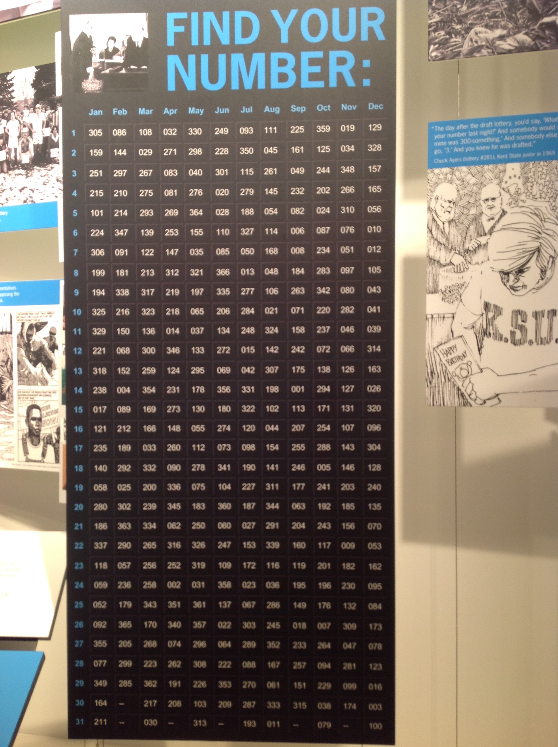 Kent5 Published October 6, 2013 at 1936 × 2592 Display at Kent State University’s May 4 Visitors Center Exhibit allows guests to find their Vietnam draft lottery number.