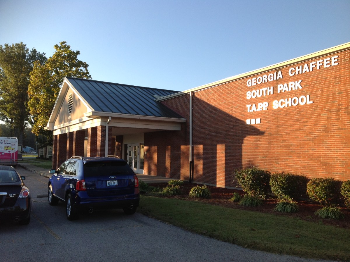 SPTAPP1 Published October 12, 2013 at 2592 × 1936 Gabby the Tinker Tour bus parked outside South Park Teenage Parent Program School, Louisville, Ky., Oct. 10