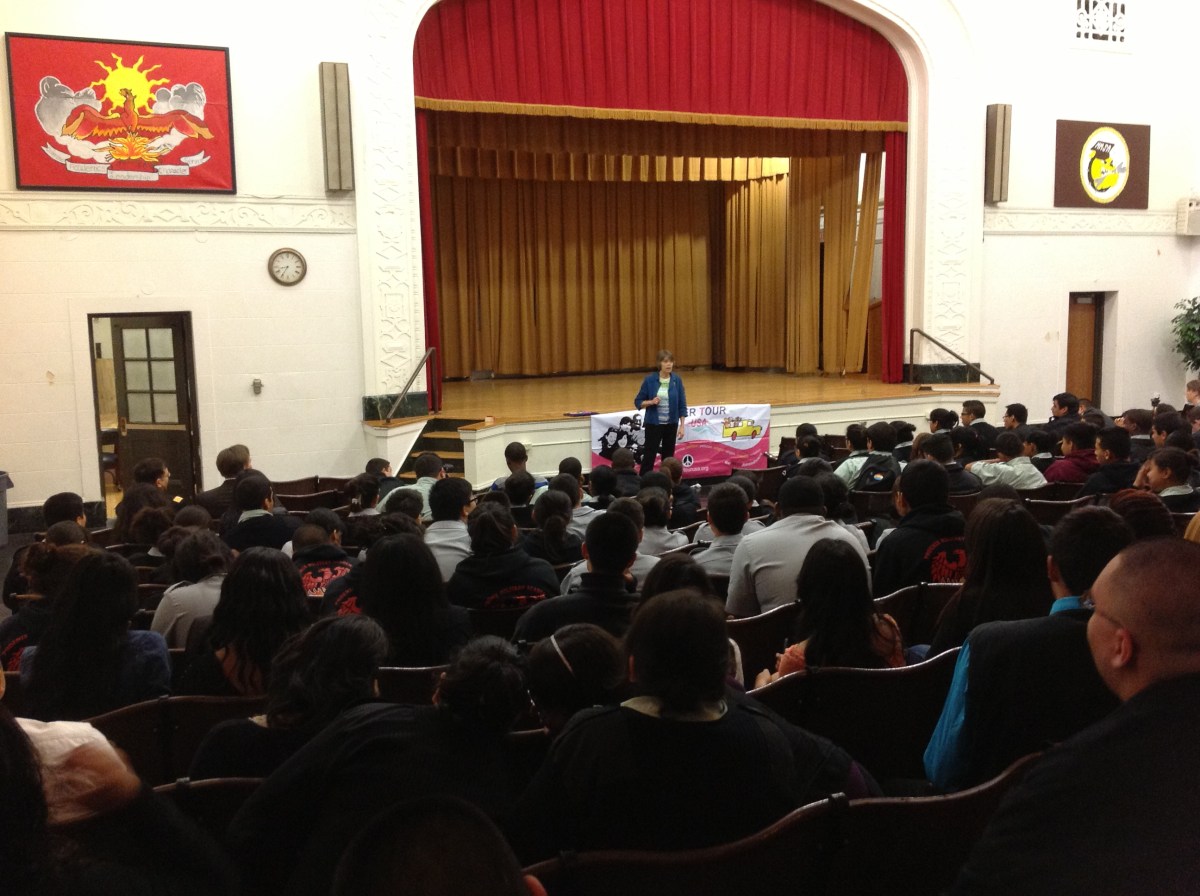 PMA_0808 Published October 20, 2013 at 2592 × 1936 Mary Beth Tinker talks with students at Phoenix Military Academy in Chicago during Tinker Tour stop Oct. 15.