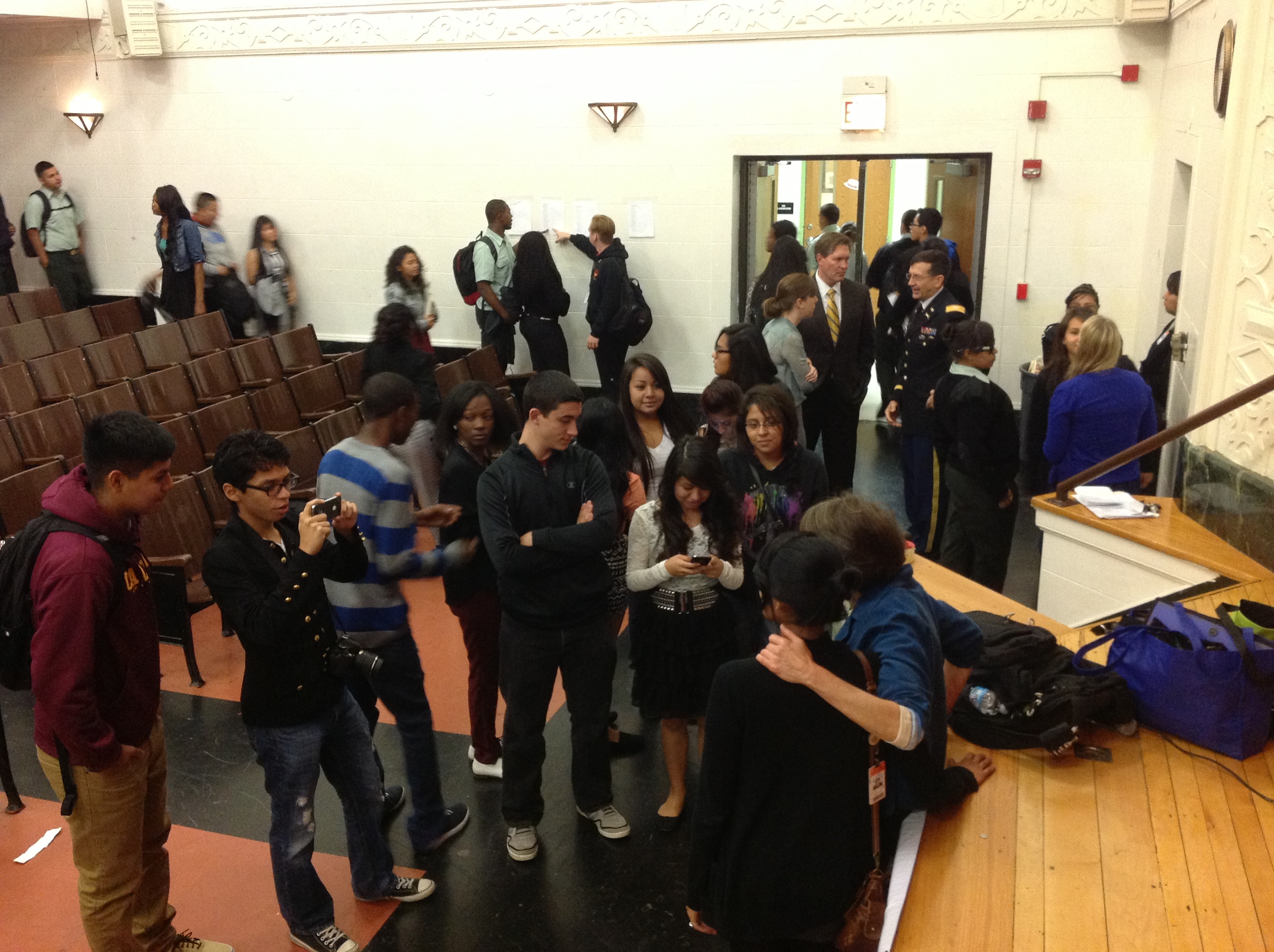 Mary Beth Tinker meets with students following her talk at Phoenix Military Academy in Chicago Oct. 15.