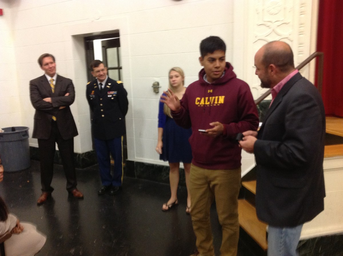 PMA_0845 Published October 20, 2013 at 2592 × 1936 Mike Hiestand talks with students at Phoenix Military Academy in Chicago during Tinker Tour stop Oct. 15.