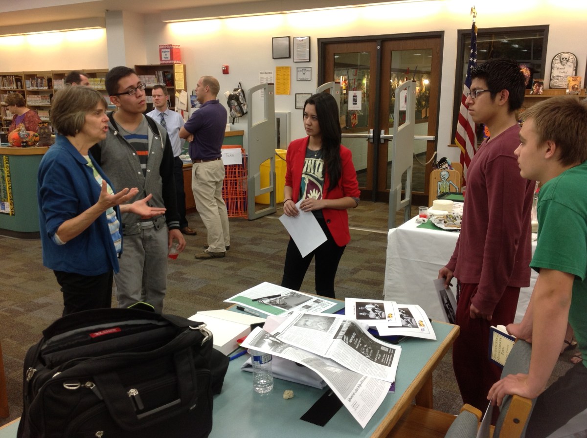 EGHS_0911 Published October 20, 2013 at 2592 × 1936 Mary Beth Tinker meets with students and teachers at a post-talk reception at Elk Grove High School, outside Chicago, Ill., during Tinker Tour stop Oct. 15.