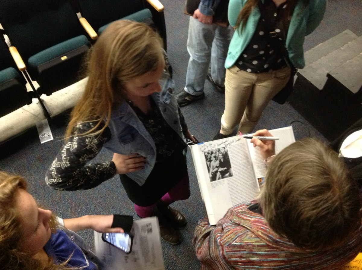 NHHS_0987 Published October 20, 2013 at 2592 × 1936 Mary Beth Tinker signs a student’s history book discussing her case during the Tinker Tour’s Oct. 17 at Nathan Hale High School in West Allis, Wisc.