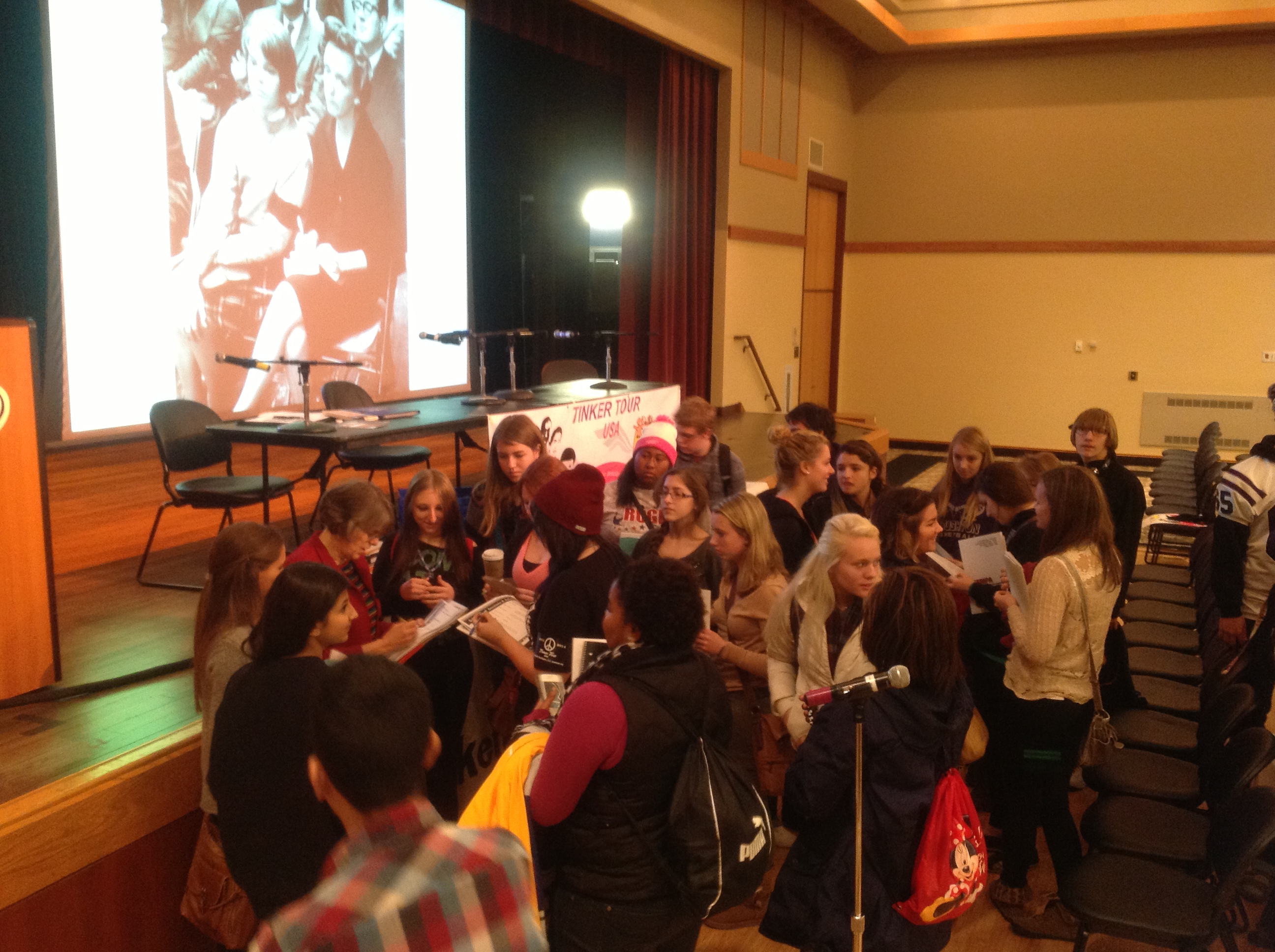 KEMPA_1066 Published October 20, 2013 at 2592 × 1936 Mary Beth Tinker greets students attending the 2013 KEMPA conference at Univ. Wisconsin-Whitewater Oct. 18