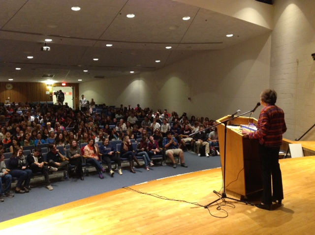 SHadley3 Published September 29, 2013 at 640 × 478 Mary Beth Tinker talks to packed auditorium at South Hadley High School Sept. 24 as part of the Tinker Tour